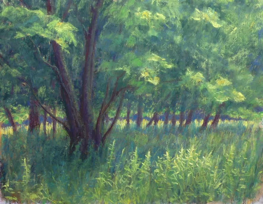 0.7 hours today. Trying to simplify a little bit, as well as introduce some variation in that line defining the edge of the field behind the trees.